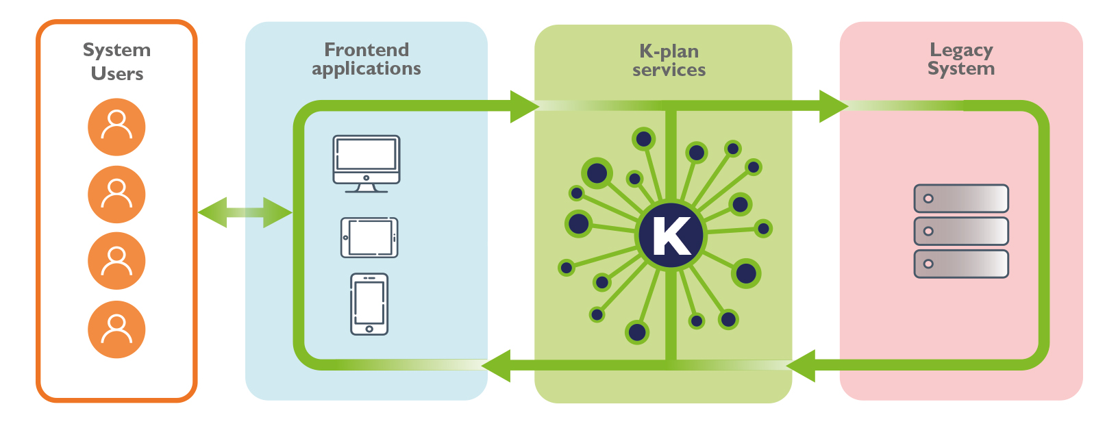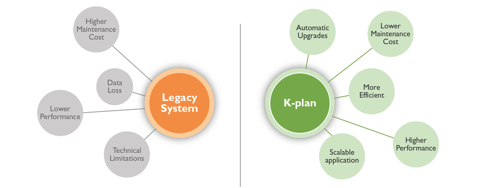 K-plan consente all’azienda una strategia “eclettica” grazie ad una facile integrazione delle app K-plan nell’ERP esistente (Legacy System). Non è infatti richiesto necessariamente di disfarsi dell’intera suite ERP esistente per passare al mix di app K-plan: si può infatti procedere con una semplice integrazione del precedente sistema o con un’ evoluzione che procede a tappe. Si tengono le applicazioni legacy fondamentali (core) che funzionano bene, mentre si migrano, sulle piattaforme K-plan le parti meno efficienti del vecchio sistema ERP. L’evoluzione verso il mix di applicazioni enterprise intelligenti di nuova generazione potrà essere completato per steps successivi a seconda delle necessità. I vantaggi di questo approccio sono evidenti, senza dover procedere a stravolgimenti repentini delle metodologie di lavoro e sostenere un gravoso impegno economico è possibile, da subito, migliorare le performance aziendali.